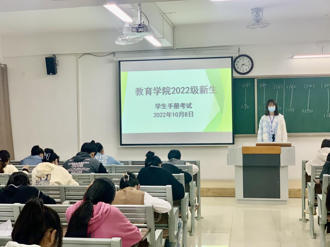 为使2022级新生尽快适应学校的教育教学和生活秩序,帮助新生知悉学校的各项规章制度,树立良好的行为规范,世界杯官网在组织新生学习学校各项管理规定的基础上,于2022年10月8号晚在1号教学楼开展新生《学生手册》应知应会知识点考试,全院49个新生班级近200名同学参加了考试,全体新生辅导员担任监考工作,学院分管副书记孟向红和团总支负责人黄莹莹担任巡考检查工作。