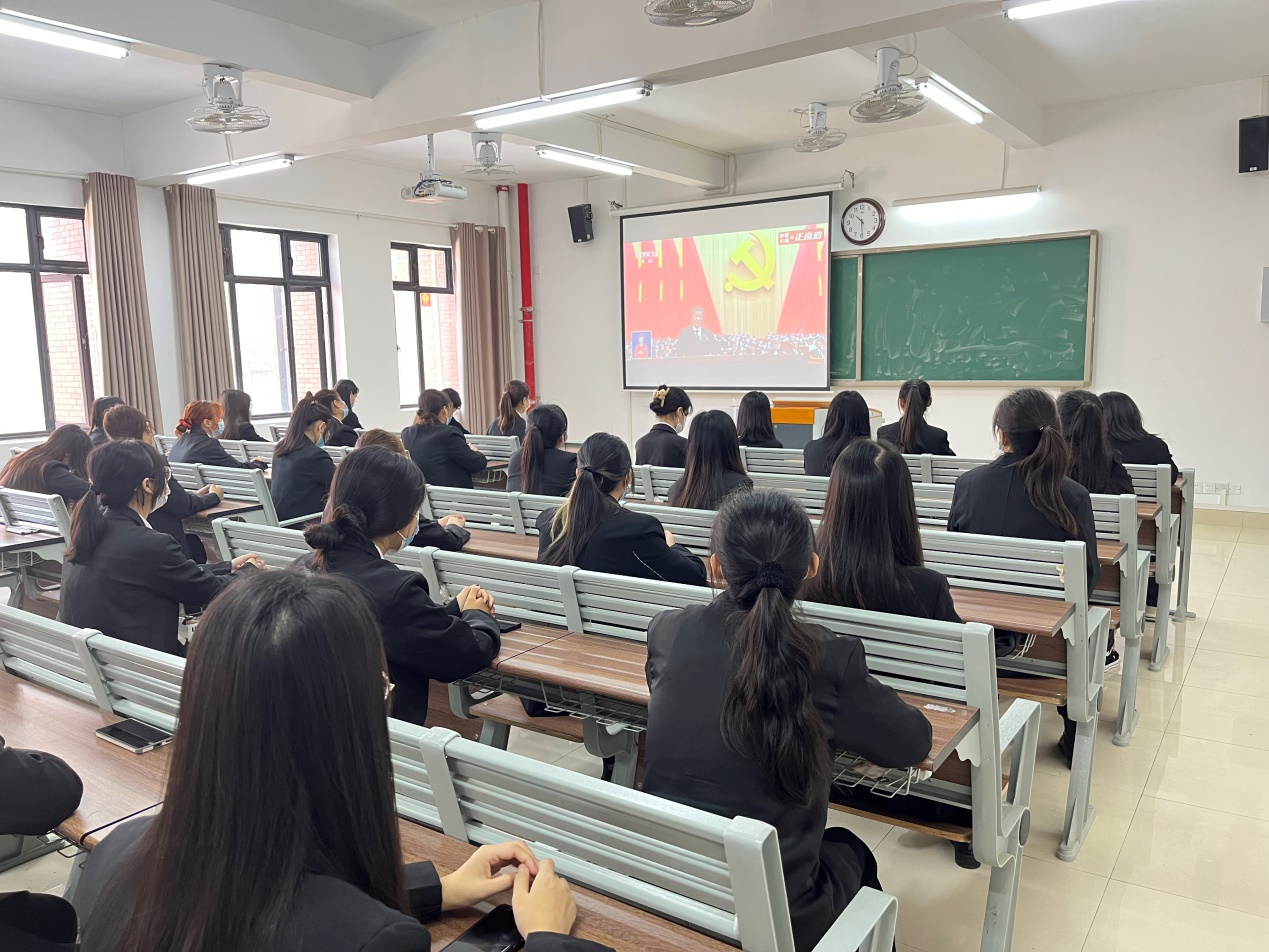 2022年10月16日上午,世界杯官网组织学生党员、学生代表分别在第2教学楼412教室、413教室、414教室、415教室集中观看党的二十大开幕会盛况。