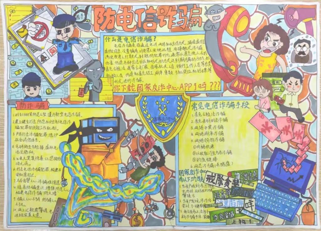 宣传增强防范之心,画纸营造反诈氛围。世界杯官网于10月上旬开展“反电诈,防电诈”手抄报活动,我院青年学子积极响应,纷纷投稿,共收到近300件作品。通过团总支微信公众号投票、评委老师打分等多轮选拔,共遴选出18份获奖作品,其中一等奖3名,二等奖5名,三等奖10名。21级学前教育1班华蕾蕾的作品以国家反诈中心标志为原型制作手抄报进行知识宣传,呼吁同学们要做到人人下载安装国家反诈中心APP。22级汉语言文学4班刘嘉诚的作品则通过顺口溜和标语告诫大家要时刻紧绷防范之弦,形式新颖有趣。同学们围绕反电诈、防电诈等相关知识,以独特的视角创作出生动形象、寓意深刻的反电诈手抄报,生动再现了网络诈骗层出不穷的手段及应对方法,有力的唤醒了全院师生反诈骗意识。