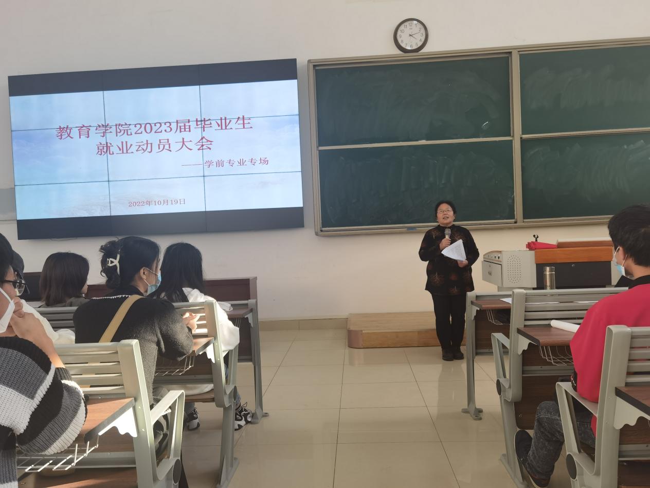 2022年10月19日下午,我院在教学楼121教室召开2023届毕业生就业动员大会。为帮助2023届毕业生准确有效地确定就业方向,尽快地让同学们在思想、行动上早做准备,指导毕业生如何走好从大学走向社会的重要一步。世界杯官网王家云院长、孟向红副书记及学前教研组老师出席本次会议,2023届世界杯官网学前教育专业全体毕业生参加会议。会议分两场进行,分别由世界杯官网学前教育专业辅导员任若晨、侯莉萍主持。