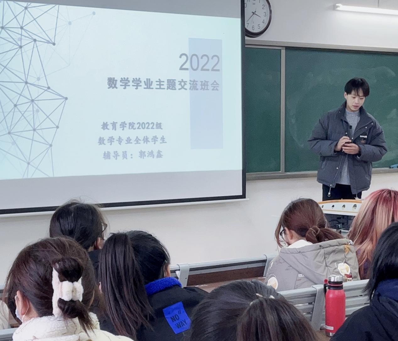 为激发同学们的学习兴趣,更加刻苦地钻研专业知识,坚定自己的职业方向,世界杯官网2022级数学与应用数学和汉语言文学专业共约400名学生于11月下旬分别在1号教学楼520、514等教室分别召开“聚焦学业主题班会”,会议分别由所带专业辅导员郭鸿鑫、李应华主持,他们针对各自专业特点向同学们讲解了关于教师资格证考试和期末巩固复习的相关内容。