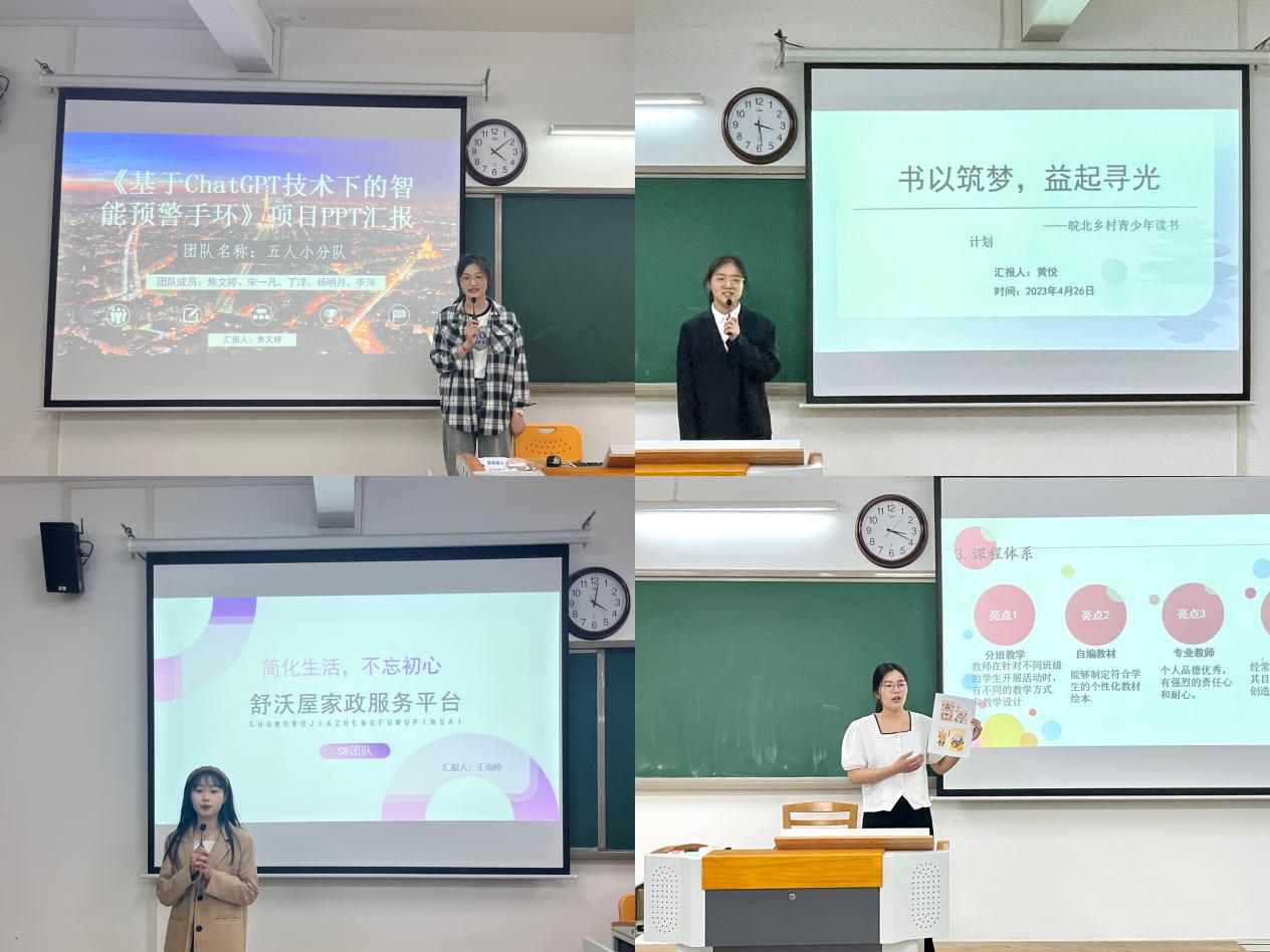 本次比赛全院同学积极响应,报名踊跃,参赛作品众多。按照比赛规定各代表队在八分钟之内分别从团队介绍、项目PPT讲解两个环节进行了项目汇报展示。比赛过程中,各团队代表胸有成竹,充分展现出新时代大学生特有的青春魅力与创新创业智慧。评委们从项目的教育维度、创新维度、团队维度、商业维度及社会价值维度等五个方面进行评判,并根据项目策划书以及现场表现进行了评分。在每支代表队汇报展示后,评委老师都从专业的角度对各项目团队进行提问,进一步了解项目详情,对作品创新性、专业性和可实施性等方面提出意见和建议,鼓励各队伍进一步提炼重点,展现项目的特点与优势。