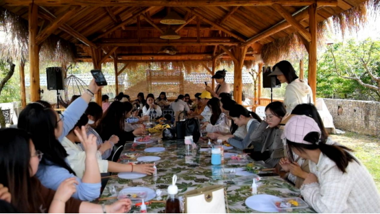在庄园向导的指引和介绍下,踏青队伍参观游览了整个庄园的风貌,大家被庄园里浓厚的烟火气息所感染,纷纷表示真切的感受到了田园生活的休闲、美好。自由活动期间,老师们或制作手工绢布花扇,或品茶赏春光,或品尝水果糕点,或执棋对弈,庄园内每一处都是他们轻松惬意、欢声笑语的美好情景。