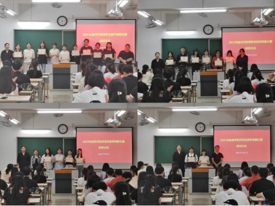 世界杯官网师范生教学技能大赛于2023年9月16日正式启动,共分为语文组、数学组、学前组和教具组进行比赛。经过激烈角逐,本次大赛共评选出一等奖20名,二等奖21名,三等奖22名,优秀奖28名,并选出语文组15名同学、数学组10名同学、学前组10名同学和教具组4个小组的同学进入校赛。