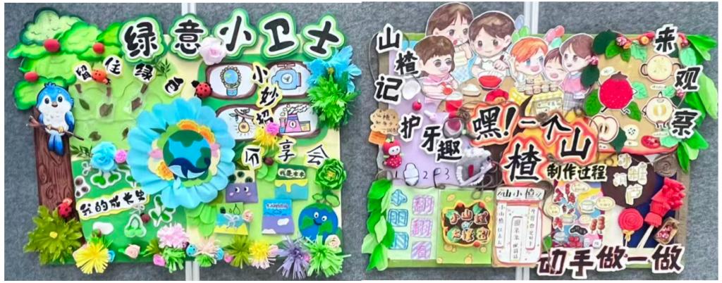 《嘿!一个山楂》主题墙饰以立体山楂造型搭配手绘人物,生动还原了山楂变身系列美食的生活场景,画面鲜活且充满烟火气;围绕日常食材“山楂”,串联“观察认知”与“动手制作”双维度,既贴近生活又充满趣味。而“共赴春日之旅”则以立体拼贴的方式呈现春芽萌发、探春之旅等景象,细节处点缀可活动的小机关,便于幼儿互动探索。这些墙饰作品兼顾视觉美感与教育价值,既通过生动设计吸引幼儿注意力,又以参与式、互动式的模块呼应“环境即教育”的理念,让墙面不止是装饰,更是能承载体验、传递温度的教育载体。
