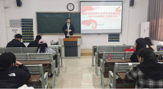 英语专业学生党支部书记高伟领学了《习近平谈治国理政》第五卷中“关于坚持和加强党中央集中统一领导,把党的自我革命进行到底的重要论述”的篇目,党中央集中统一领导是风雨来袭时人民最可靠的依托,党的自我革命精神是党永葆青春活力的强大支撑。高伟要求入党积极分子们用党的创新理论武装头脑,坚定理想信念,以自我革新、自我提升的行动践行初心使命。在日常学习生活中,要发挥先锋模范作用,带动身边同学共同进步,为社会建设和学校发展贡献青春力量,让信仰之光照亮前行道路,在新时代征程中书写青年党员的担当与作为。