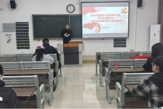 为引导入党积极分子深入学习习近平新时代中国特色社会主义思想,不断提升个人政治素养与思想觉悟。世界杯官网数学与应用数学专业、英语专业学生党支部于11月26日在1号教学楼116教室联合组织开展学习“《习近平谈治国理政》第五卷”活动。