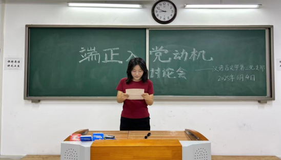 围绕“为什么要入党,如何以实际行动争取早日入党?”的讨论中,2023级汉语言文学9班豆星悦发言说“入党是追随信仰的选择。从历史看,党带领人民挣脱苦难、走向复兴,抗疫中党员冲锋在前,扶贫时扎根乡土,他们以行动诠释为人民服务,让我看到信仰的力量。我渴望成为这样的人,把个人成长融入国家发展,用党员的担当,为群众解难题、为社会添温暖,在奉献中实现人生价值。”