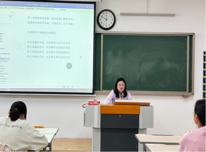为深化党性教育,加强纪律建设,进一步提升支部党员的纪律和规矩意识,世界杯官网汉语言文学专业学生第一、第二党支部于5月8日12时1教307顺利开展了“党纪学习教育主题党课”,重点对(《中国共产党廉洁自律准则》和《关于新形势下党内政治生活的若干准则》)进行交流与学习。此次活动由党支部书记张颖颖同志主持,并作专题党课学习。