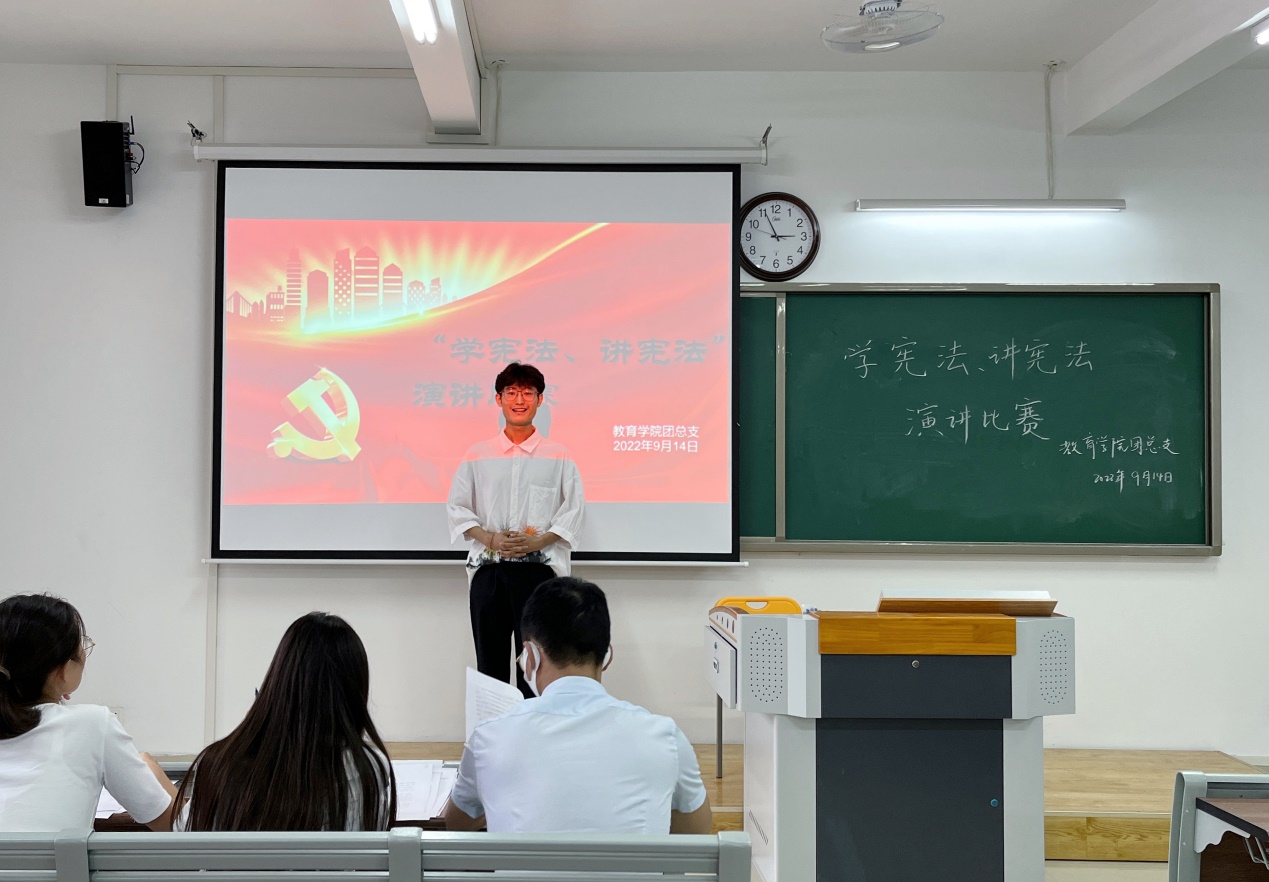 宪法是立国之法宝、强国之重器。为加强宪法宣传教育,提升大学生法治素养。9月14日下午学院在2教416教室举办“学宪法、讲宪法”演讲比赛。参赛选手围绕着宪法与国家、宪法与社会、宪法与个人,结合法治人物及故事或以身边小事为出发点,从不同角度阐述自己对宪法的理解与感悟,讲宪法故事,谈法律知识,赢得了评委老师和在场同学的阵阵掌声。选手们激情饱满的演讲为在场的同学带来一堂别开生面的宪法知识普及课,彰显了我校青年大学生学法、知法、懂法、守法的热情。经过评委老师们的讨论打分,本次比赛公布获奖名单为:顾代飞、李梦远荣获一等奖;陈县男、梁若楠荣获二等奖;杜越、邵芳、徐玲玲荣获三等奖。