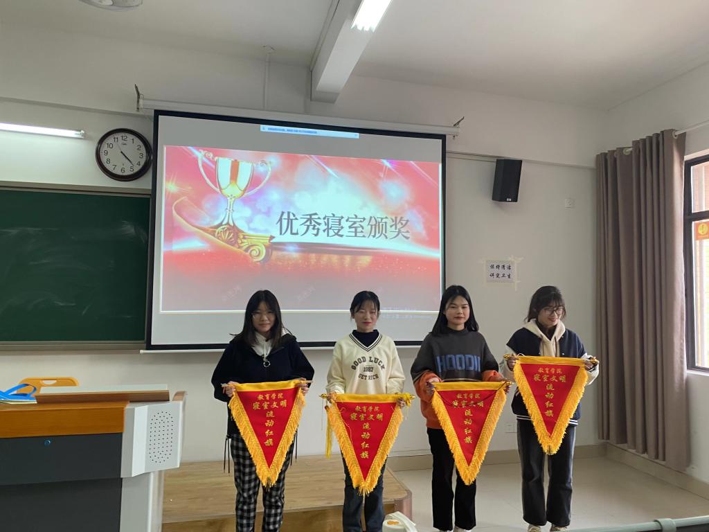 本着公平公正的原则,本次宿舍检查评选出503,507,521,531四个寝室为优秀寝室。李应华老师在宿舍长会议上为获奖寝室颁奖,授予优秀寝室流动红旗,获奖寝室长激动又自豪,当即表示今后会继续带领室友保持寝室的干净整洁。