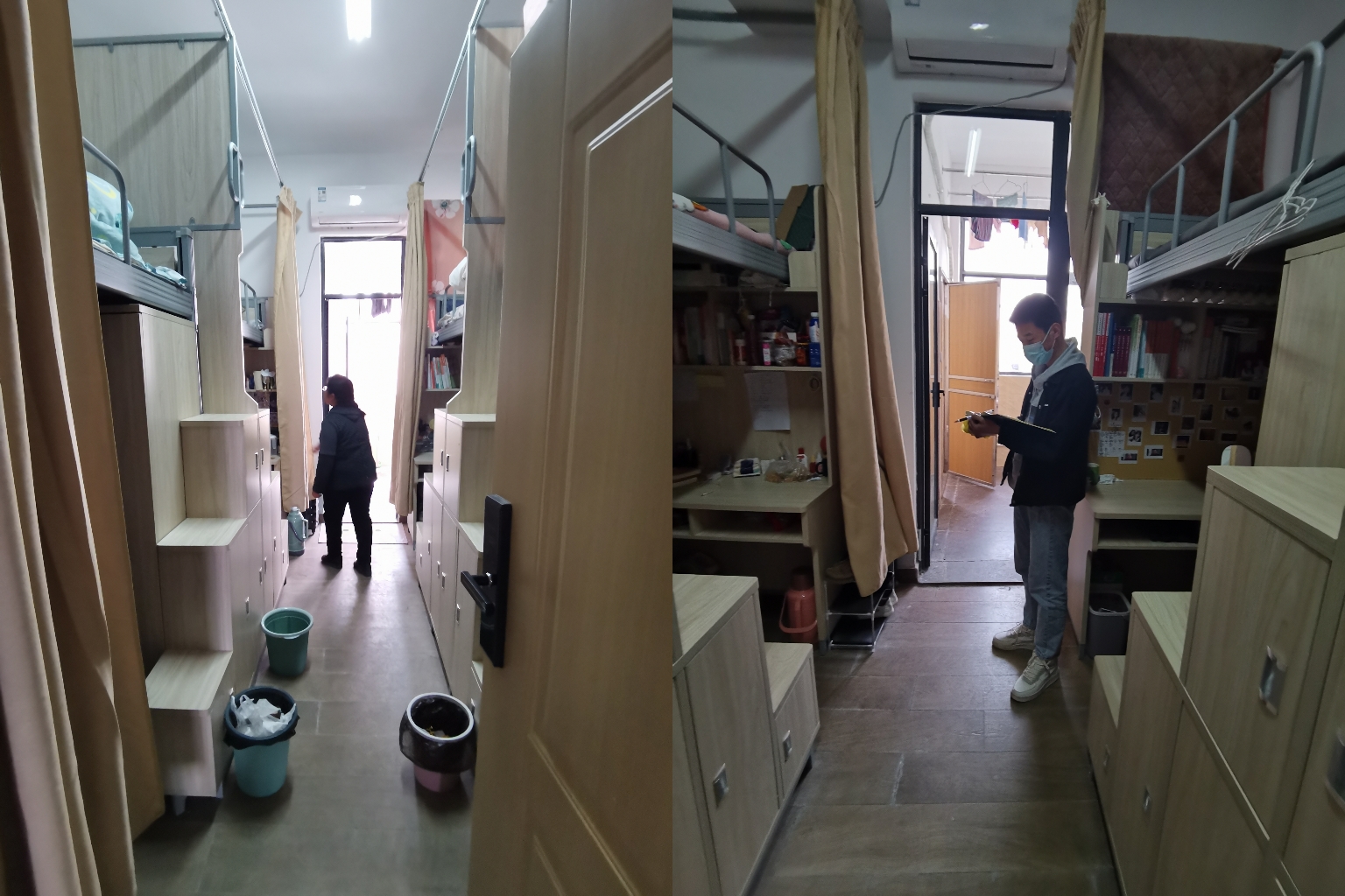 老师们深入学生寝室,仔细查看同学们寝室卫生是否整洁、寝室用电是否安全、是否有私拉乱接电线情况以及是否有违规使用大功率电器等情况。孟向红与同学们亲切交谈,关心大家的生活起居,指导同学们做到了勤开窗通风,勤做大扫除,被褥叠放整齐,地面、桌面干净整洁,用电合理安全。