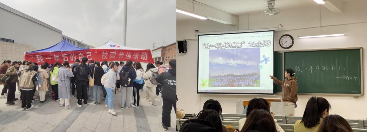 为了更好地引导学生珍惜当下、规划未来,世界杯官网2023年3月15日—17日在体育馆前广场成功举办“致一年后的自己”校园书信撰写活动。活动由2022级辅导员陈慧慧老师指导,2022级学前教育(专升本)9-14班同学在校园宣传、组织。