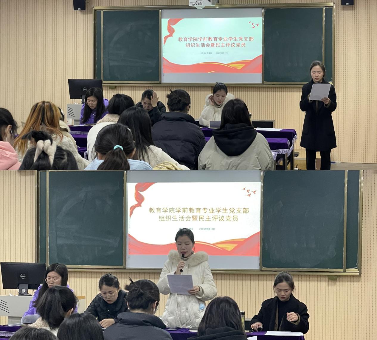 汇报结束后王家云同志对教工党支部、学前教育学生支部汇报情况进行点评,孟向红同志对数学与应用数学学生支部、英语学生支部和汉语言文学学生支部汇报情况进行了点评。王家云同志在点评时对支部工作给予充分肯定,并提出要求:一是建立常态化学习工作机制,二是增强意识形态风险防范意识,三是加大青年教师组织发展力度,四是发挥支部党员教师在教学科研中的模范带头作用,他强调要加强党支部标准化规范化建设,进一步调动党员积极性,发挥专业优势,有效促进党建与发展的深度融合,以高质量党建推动学院高质量发展。孟向红同志对三个学生支部工作进行点评,肯定了支部在组织带领学生党员开展理论学习、志愿服务、发挥作用等方面取得的成绩,同时她要求支部认真落实整改措施,创新党员学习教育管理形式,发挥学生党员在学风建设、学生日常管理等方面的作用,把“党员好故事、书记好党课、支部好案例”工作抓好、抓落实,彰显党建品牌特色。