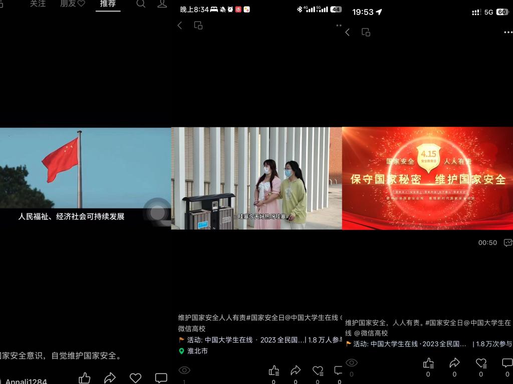 4月15日至4月22日,学院创新宣传方式,组织学生利用微信、微博等平台发布原创短视频和宣传标语参与“国家安全”话题接力和互动,进行宣传教育。