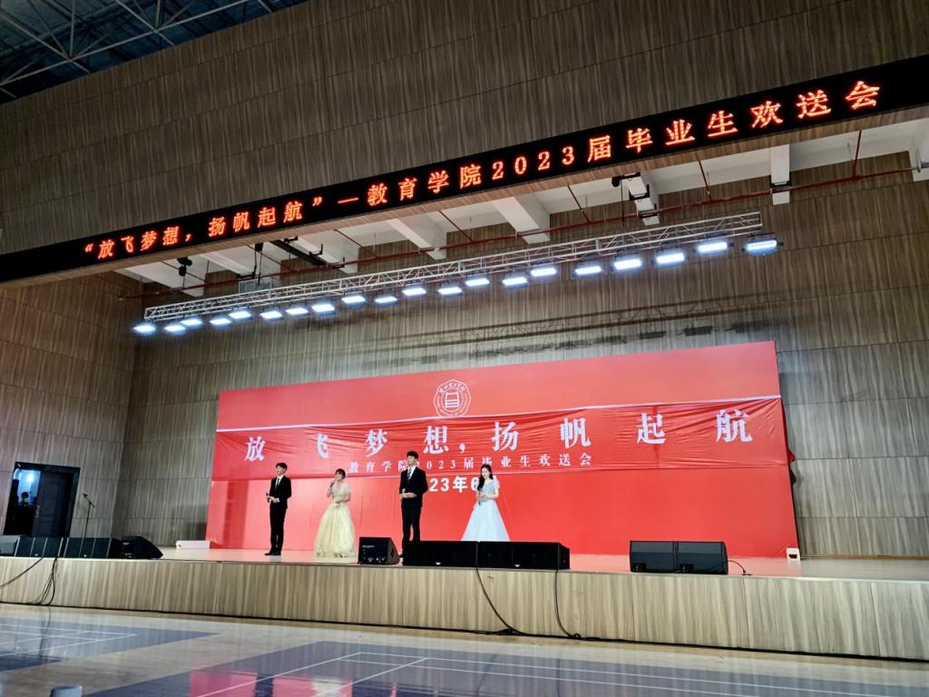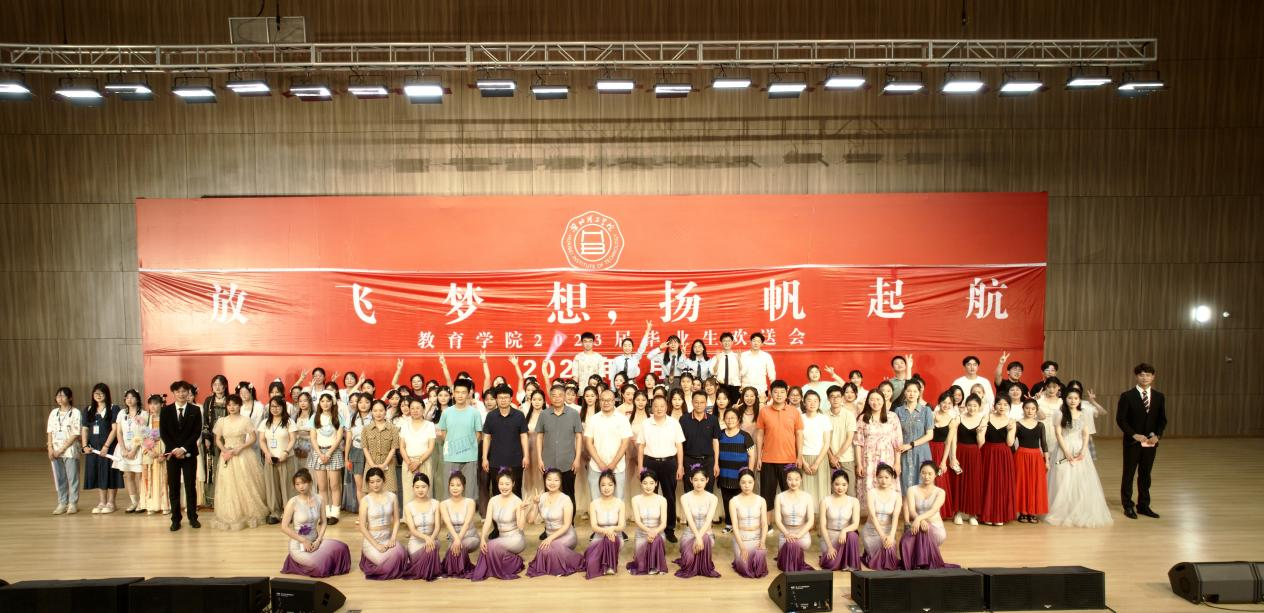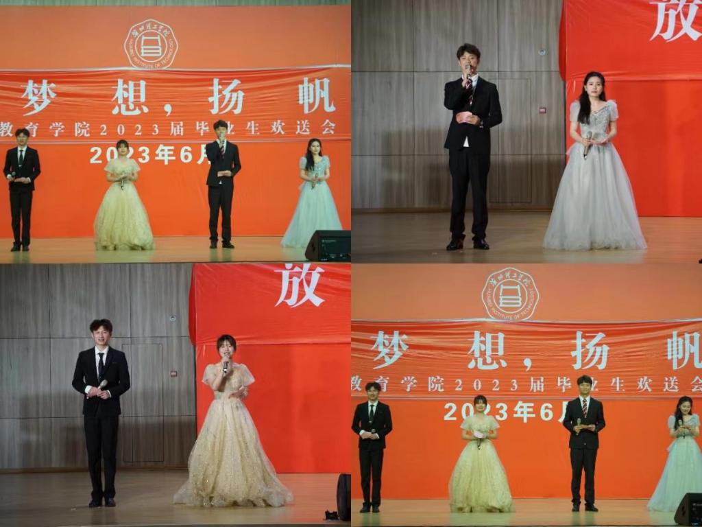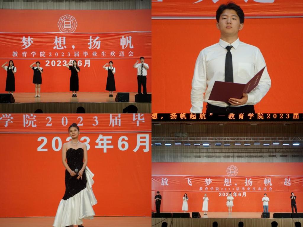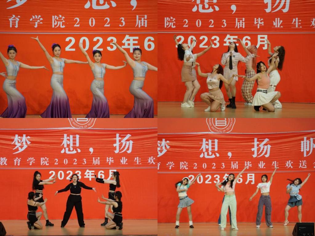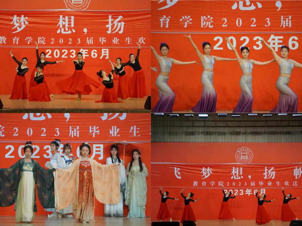 一首独唱《锦绣前程》为送上对毕业生们的美好祝愿,《青年路八号的日子》表达了毕业生们对淮理工的热爱、对校园生活的眷恋、对老师们离别的不舍之情;紧接着爵士舞《fearless》和《talk that talk》燃爆全场;同学们自主排练的傣族舞《竹林深处》的翩翩舞姿,婀娜多姿;汉服走秀随着年代更迭,服饰也随之转变,让同学们领略历史的魅力;《灯火里的中国》、《我心向党同奋斗,青春聚力正当时》用歌曲和朗诵诠释了新时代青年的初心使命、责任担当;合唱《那些年》、歌曲串烧《起风了+晴天》把欢送会推上高潮;最后,一首《逆战》点燃气氛,为本次晚会完美结局。一张大合照,为本次2023届毕业生欢送会画上句号。
