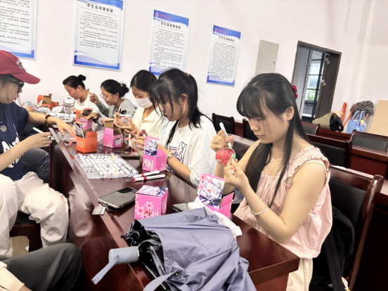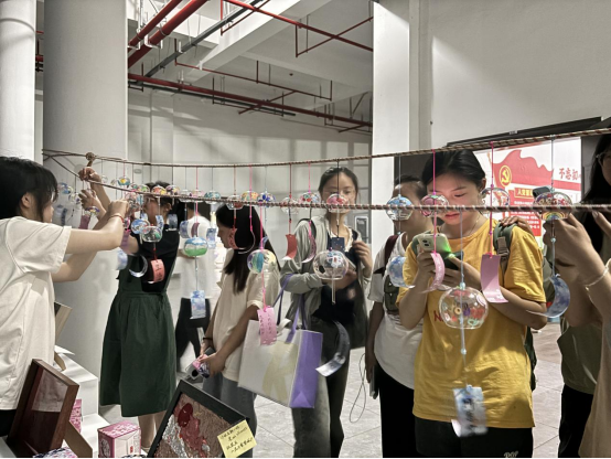 在创作过程中,同学们相互合作,友好交流,分享自己的作品。大家沉浸在轻松舒适的氛围中,用风铃实现自我表达和情感抒发,达到了心理减压的良好效果。最后,同学们将自己的作品挂在艺术楼一楼大厅进行展示。