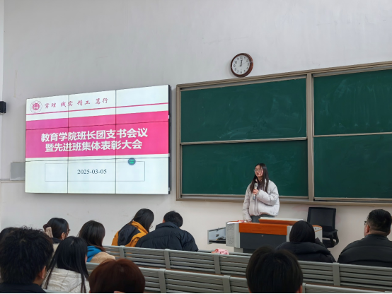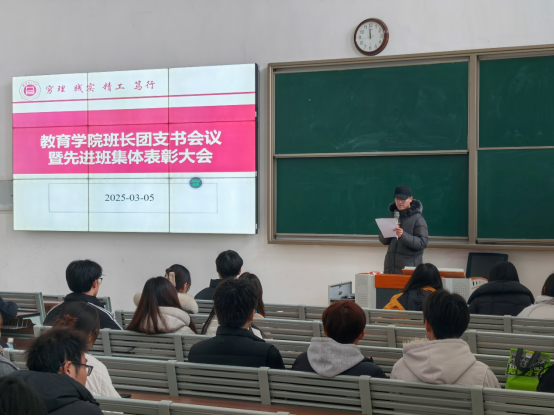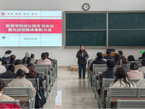 为促进班级管理交流,增强各班学生干部工作能力和激励全院班级努力营造良好班集体氛围。3月5日中午,世界杯官网在一号教学楼121教室开展了“班长、团支书会议暨先进班集体表彰大会”。会议由学院团总支副书记许海涛主持,分管副书记孟向红、书记助理黄莹莹、24级全体辅导员以及各班班长、团支书参加了会议。