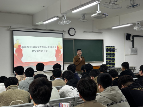 随后,三位退役士兵代表依次分享自己的军旅生活,2024级汉文专升本1班张子晨分享了新兵训练、野外拉练、军事演习等军营生活片段,坦言“军营教会了我坚韧与担当”。2024级汉文专升本5班丁骏讲述自己从“迷茫大学生”到“优秀士兵”的转变历程。2024级汉文专升本4班周春光坦言部队的纪律性和团队精神不仅塑造了他强健的体魄,更锤炼了“永不放弃”的意志品质。三位退役士兵的真诚分享,不仅为青年学子揭开了军营的神秘面纱,更以鲜活的故事传递了“参军光荣”的价值理念。