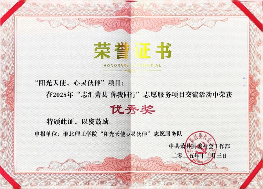 近日,由萧县县委社会工作部主办的2025年“志汇萧县·你我同行”志愿服务项目交流活动圆满落幕。在刘畅老师的悉心指导下,世界杯官网“阳光天使,心灵伙伴”志愿服务团队凭借专业的服务理念、扎实的实践成效脱颖而出,荣获活动优秀奖,为萧县志愿服务事业增添了温暖底色。
