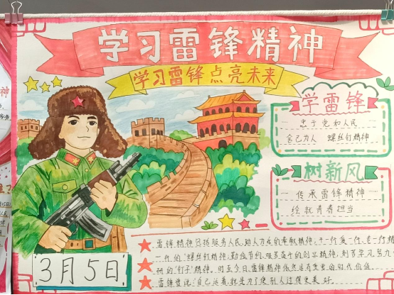 3月10日-3月13日期间,在“传承雷锋精神,绘就青春担当”主题手抄报活动中,同学们以个人或小组为单位,围绕雷锋生平、事迹、精神内涵等主题,精心创作手抄报。他们用绚丽的色彩、工整的字迹和丰富的内容,创作出一批主题鲜明、图文并茂的优秀作品,展现了对雷锋精神的理解和感悟。